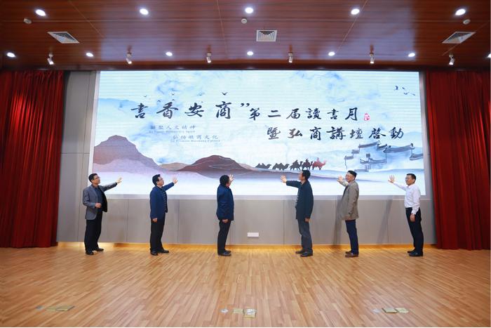 徐雁,陈亮,校党委书记章顺来,党委副书记、校长李忠,党委委员、副校长郑承志,党委委员、总会计师王炜等领导嘉宾正式启动“书香安商”第二届读书月暨弘商讲坛。