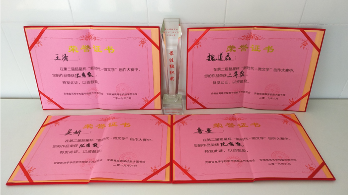大赛历时2个多月,吸引了来自全国超过300所高校参与,参与人数超过20000人,发表作品14525篇,大赛活动页面点击量超过70万次。经过审稿组审核、学生投票,全国确定晋级作品240篇,我校在全国高职院校中,晋级作品四篇,位居第一。经专家组二次评选,安徽赛区确定晋级决赛作品40篇。经过激烈角逐,专家终审,我校房地产经营与管理171 班魏道磊同学的作品《私欲》以一对平凡男女朋友的双视角,讲述了人性中弱点与大爱,获得三等奖。会计189班鲁蔓同学的作品《悲伤中的幸福》、财务管理171班王涛同学的作品《一只无形的线》、商务数据分析与应用181班吴妍同学的作品《辞别》等荣获优秀奖。