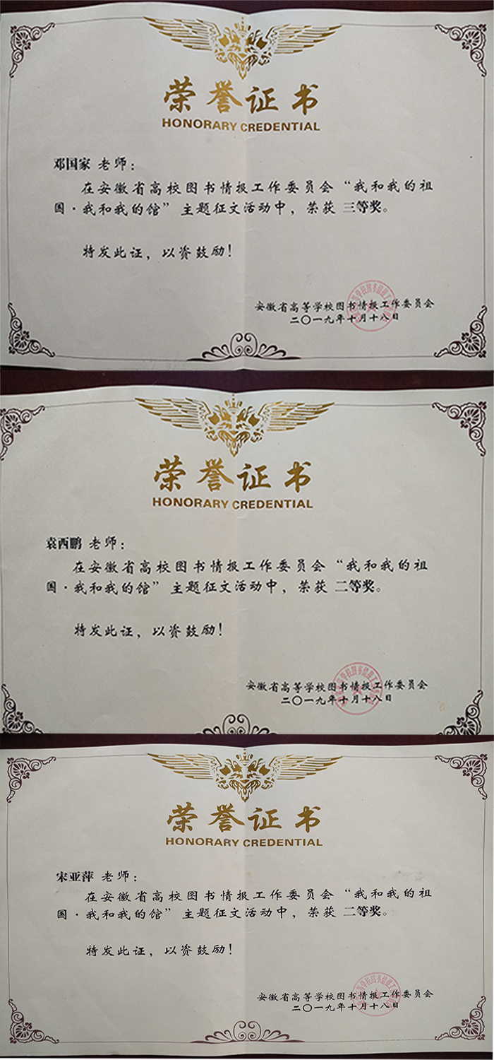 在历时两个月的征文活动中,我校图书馆积极组织馆员参赛,通过精心组织,提交的3篇作品均获奖。其中,宋亚萍老师的作品《灯豆一室四壁清辉》和袁西鹏老师的作品《图书馆里的守望者》分别荣获二等奖,邓国家老师的作品《泛黄的卡片与永不泛黄的记忆》荣获三等奖。