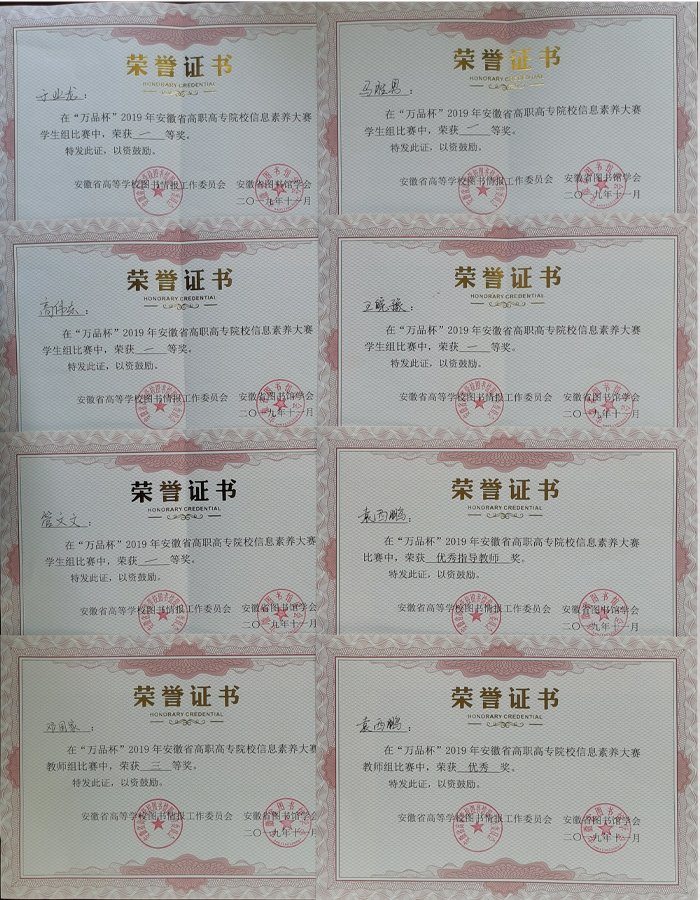 2019年11月1日,全省共有24支代表队,111名学生参加了在安徽医学高等专科学校举行的安徽省高职高专院校信息素养大赛。参赛学生使用中国高等教育文献保障系统CALIS指定比赛平台,在规定时间内上网答题,按个人成绩及答题时长进行全省排名统计,选拔我省参加2019年全国高职高专院校信息素养大赛选手。经过激烈角逐,大赛评选出一等奖11名、二等奖22名、三等奖33名。我校物流管理172于业龙、物流管理173马胜男、房地产经营与管理171高伟东、物流管理173管文文、云计算计算与应用173王皖豫均荣获一等奖,于业龙、马胜男成功入围全国决赛。在教师组现场说课比赛中,邓国家老师的作品《中文网络信息资源检索》获得了评委老师的好评,最终名列全省第七。