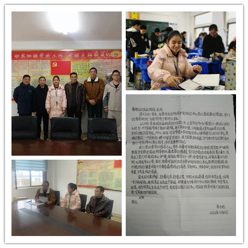 近日,为学习贯彻习近平总书记在全国脱贫攻坚表彰大会上的重要讲话精神,图书继教党支部与学校驻潜山市龙潭乡漆铺村工作队联系,了解到李子彤同学的学习情况和家庭背景后,支部7名党员为其发起助学捐助活动,共筹集爱心款1200元。2月26日,学校帮扶工作队第一书记、队长魏强代表图书继教党支部全体党员将书信和助学金一并转交到她手中。