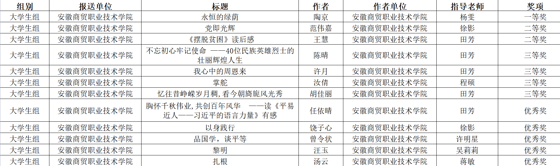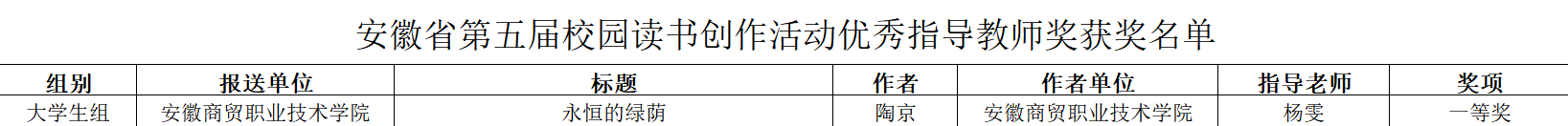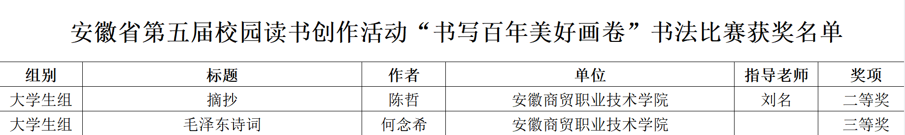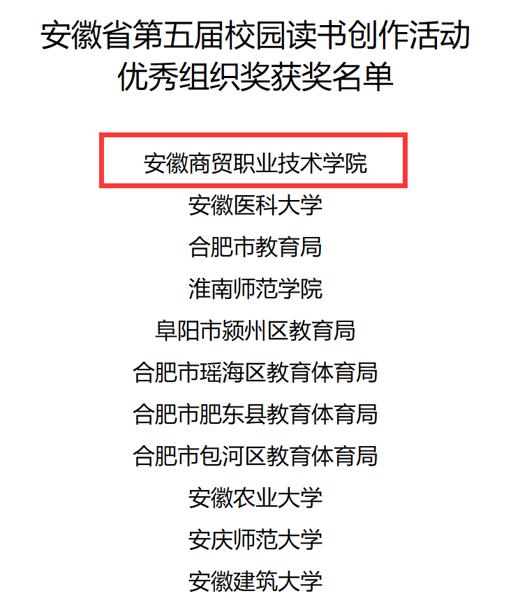 近日,由省委教育工委、省教育厅、省人力资源和社会保障厅、省文化和旅游厅、省新闻出版局、团省委共同主办的安徽省第五届校园读书创作活动获奖名单公示结束,我校在此次比赛中脱颖而出,荣获“优秀组织奖”,综合排名全省第一。此外,我校报送的征文作品全部获奖,其中一等奖1项、二等奖2项、三等奖4项、优秀奖5项;我校报送的书法作品获二等奖1项,三等奖1项;国际商务与旅游学院杨雯老师荣获“优秀指导教师”称号。