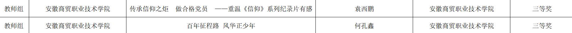 在“致敬百年风华,勇担时代使命”主题征文比赛中,我校商务英语201陶京荣获学生组一等奖,市场营销201范伟嘉、文秘202王慧荣获学生组二等奖,文秘201陈晴、文秘201许月、会计206汝倩、文秘201胡佳丽荣获学生组三等奖,文秘201任依晴、商数201饶子心、移动应用201曾令状、人力资源202汪玉、商务英语191汤云荣获学生组优秀奖,国际商务与旅游学院杨雯老师荣获“优秀指导教师”称号;在教师组征文比赛中,我校电子商务学院何孔鑫、图书馆袁西鹏荣获三等奖。